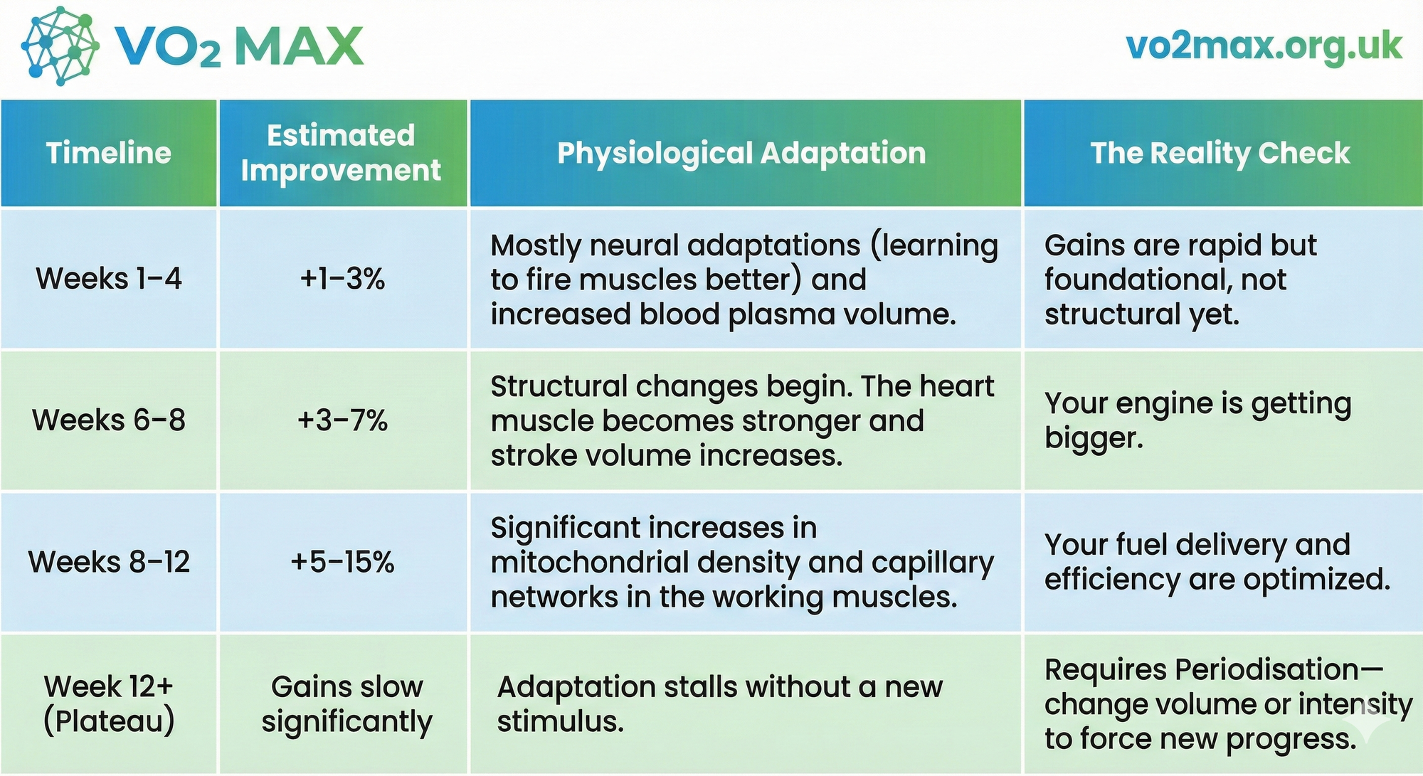 Physiological adaptation takes time. Based on data from untrained to moderately trained individuals, here is a realistic timeline for VO₂ max improvement.²⁸